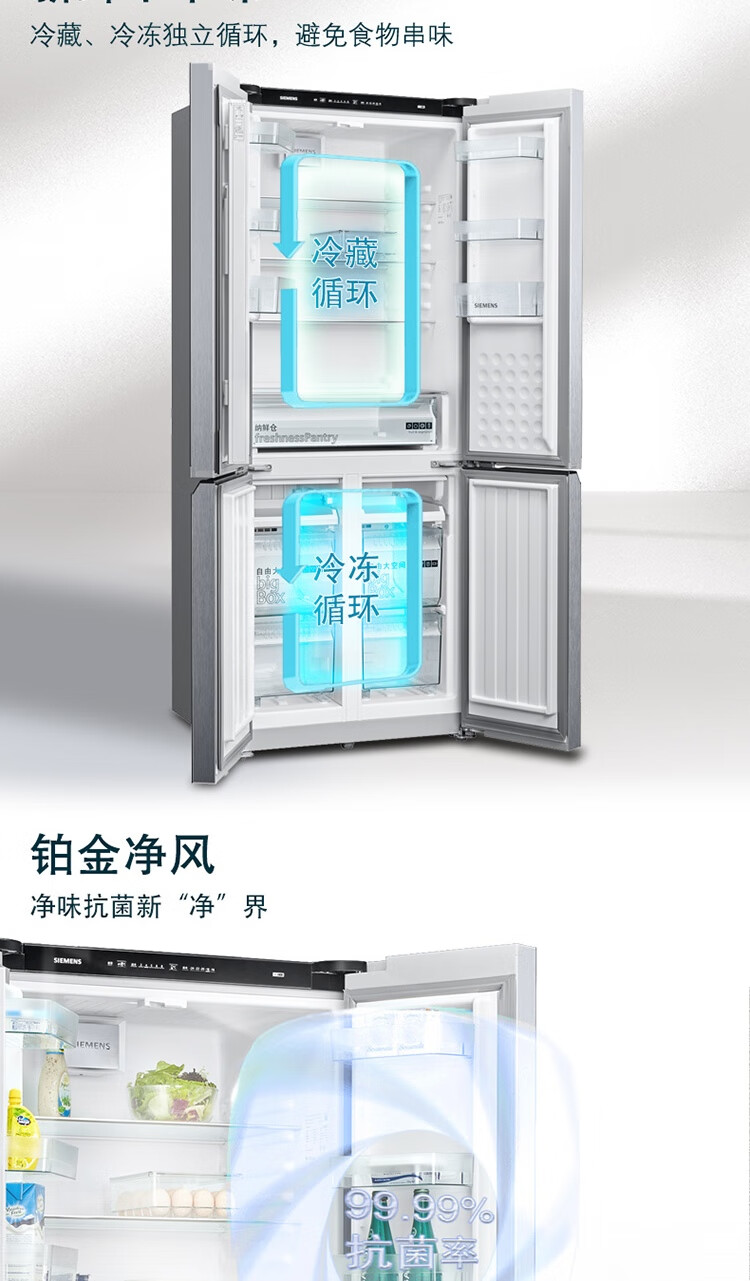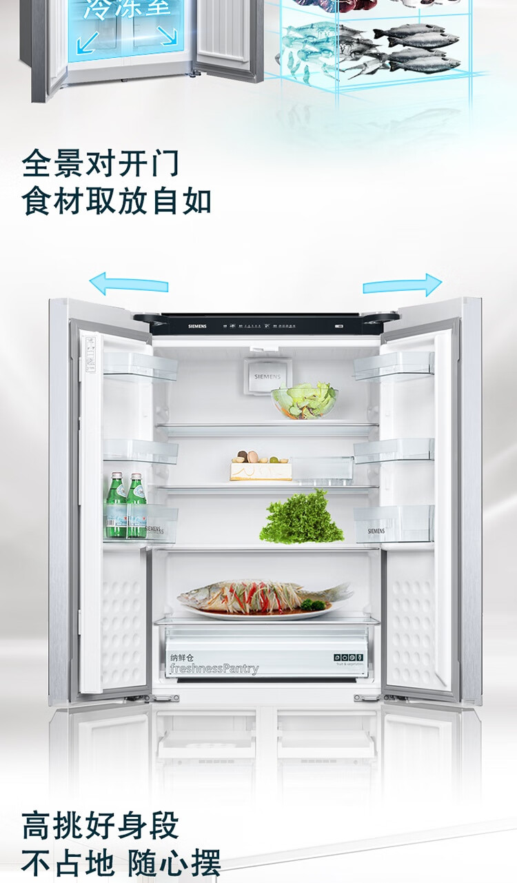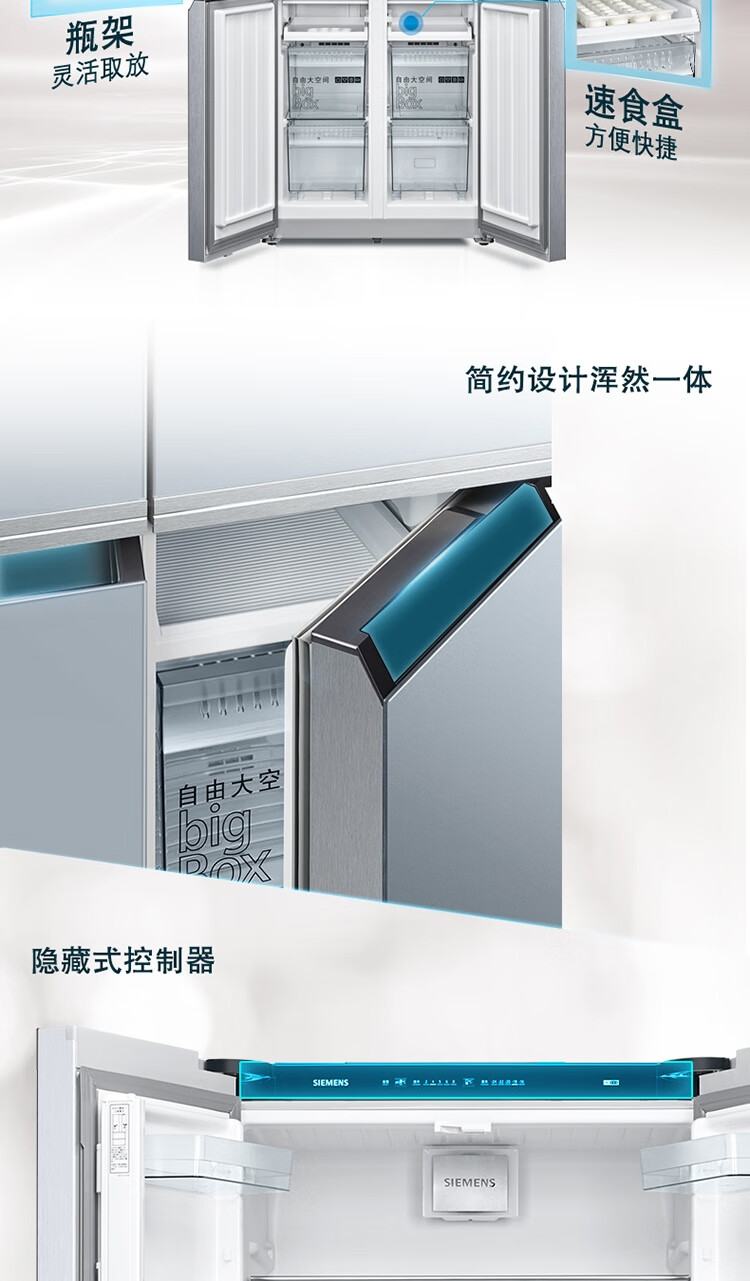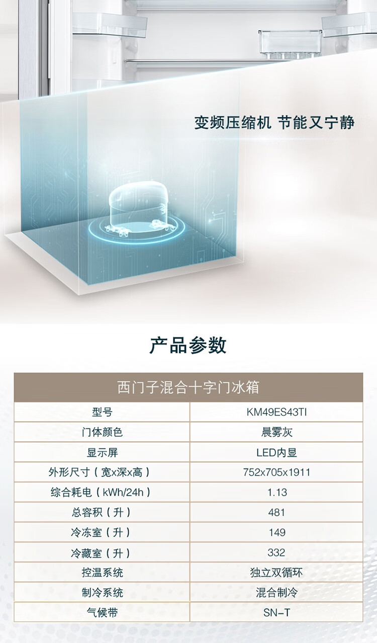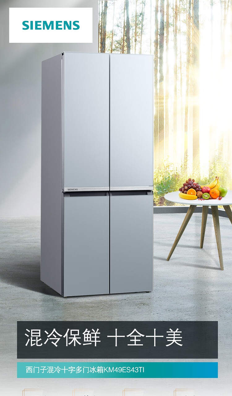 西门子(SIEMENS)481升十字对开门四开门冰箱 家用大容量 混冷无霜 玻璃面板 (晨雾灰) KM49ES43TI