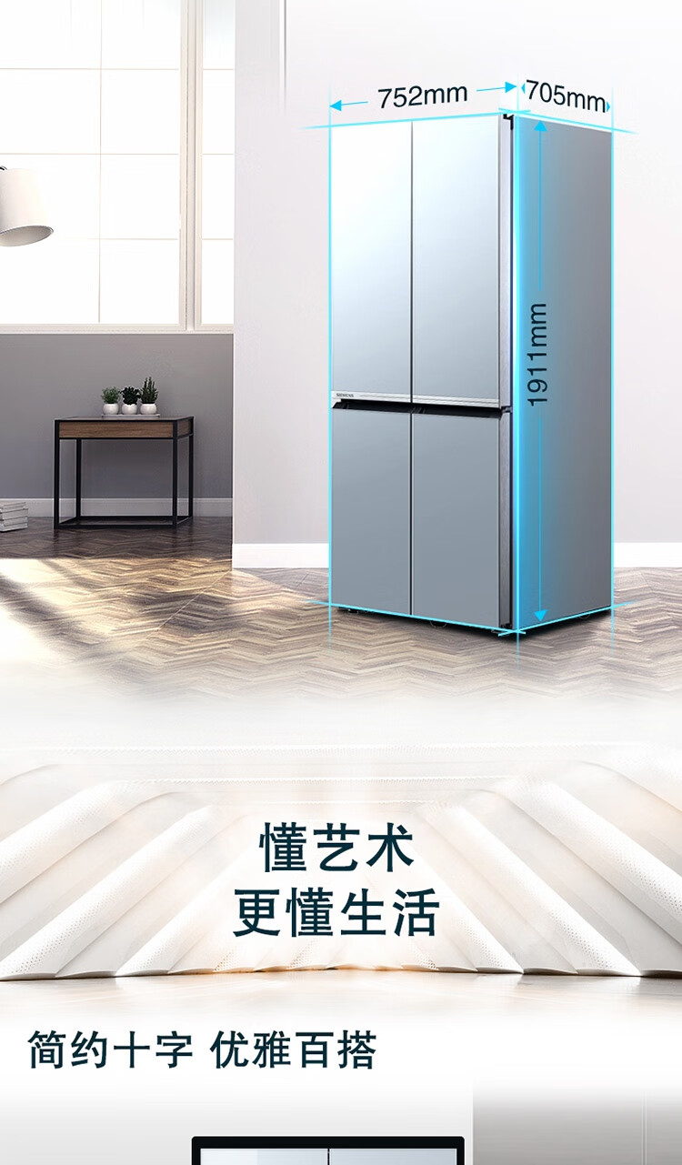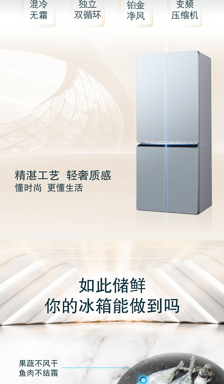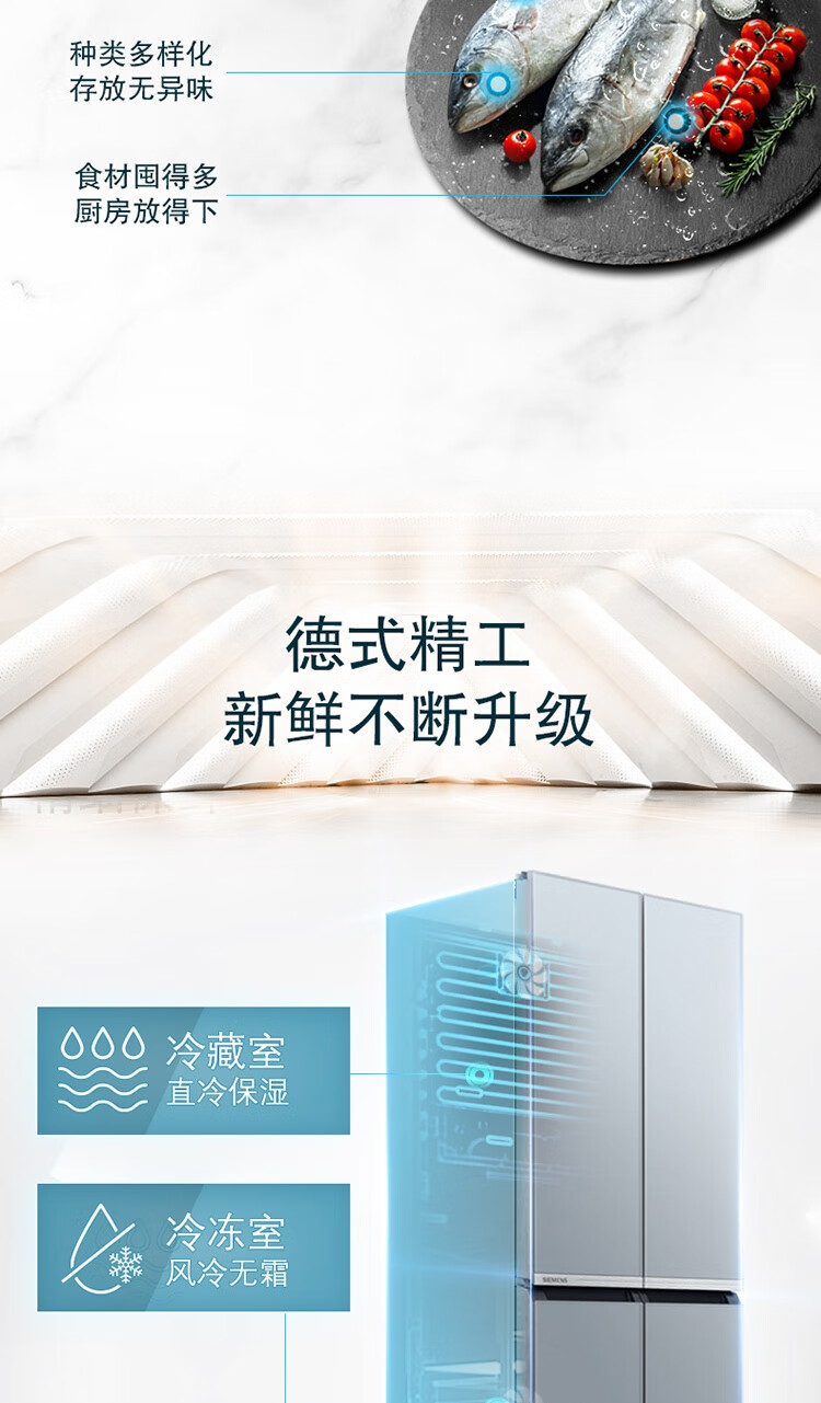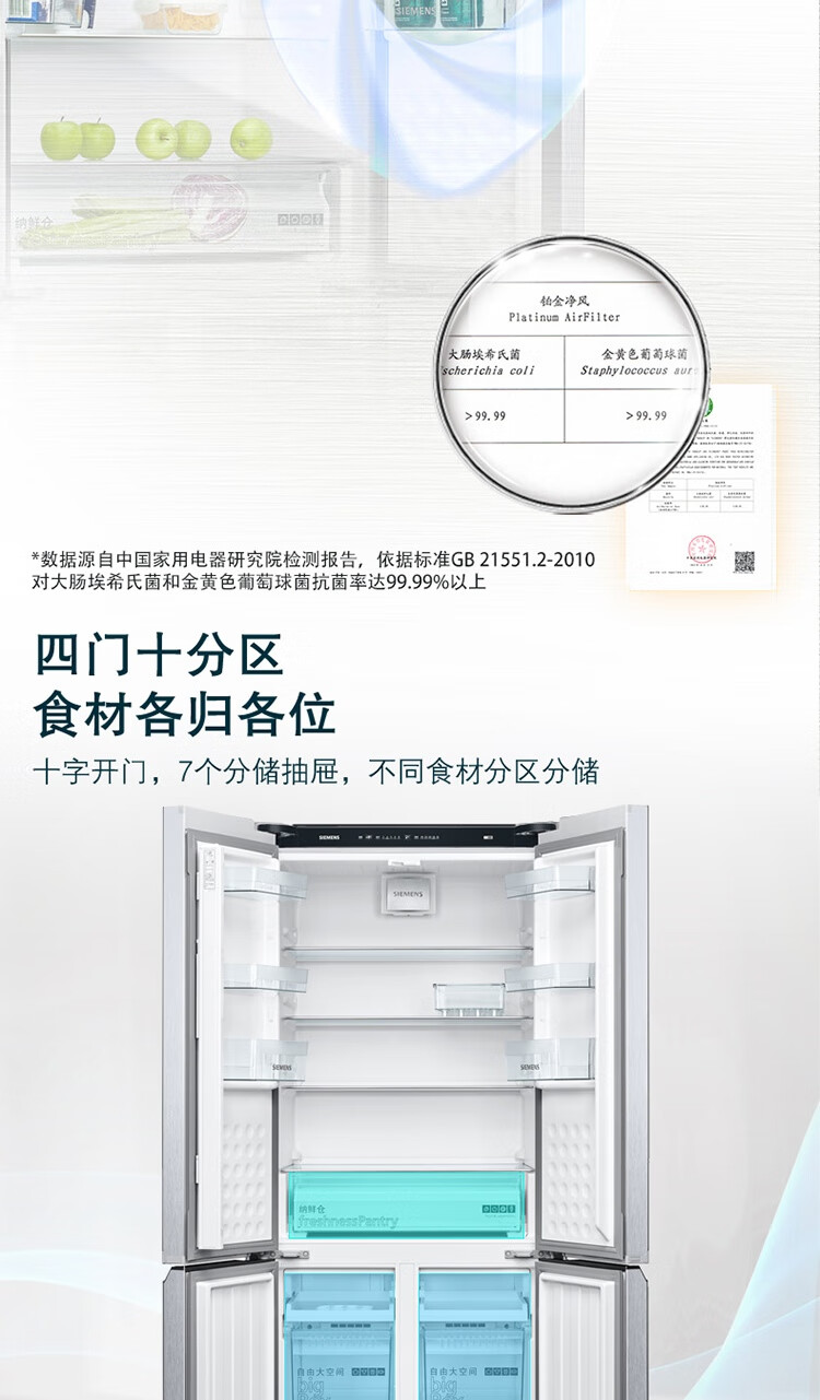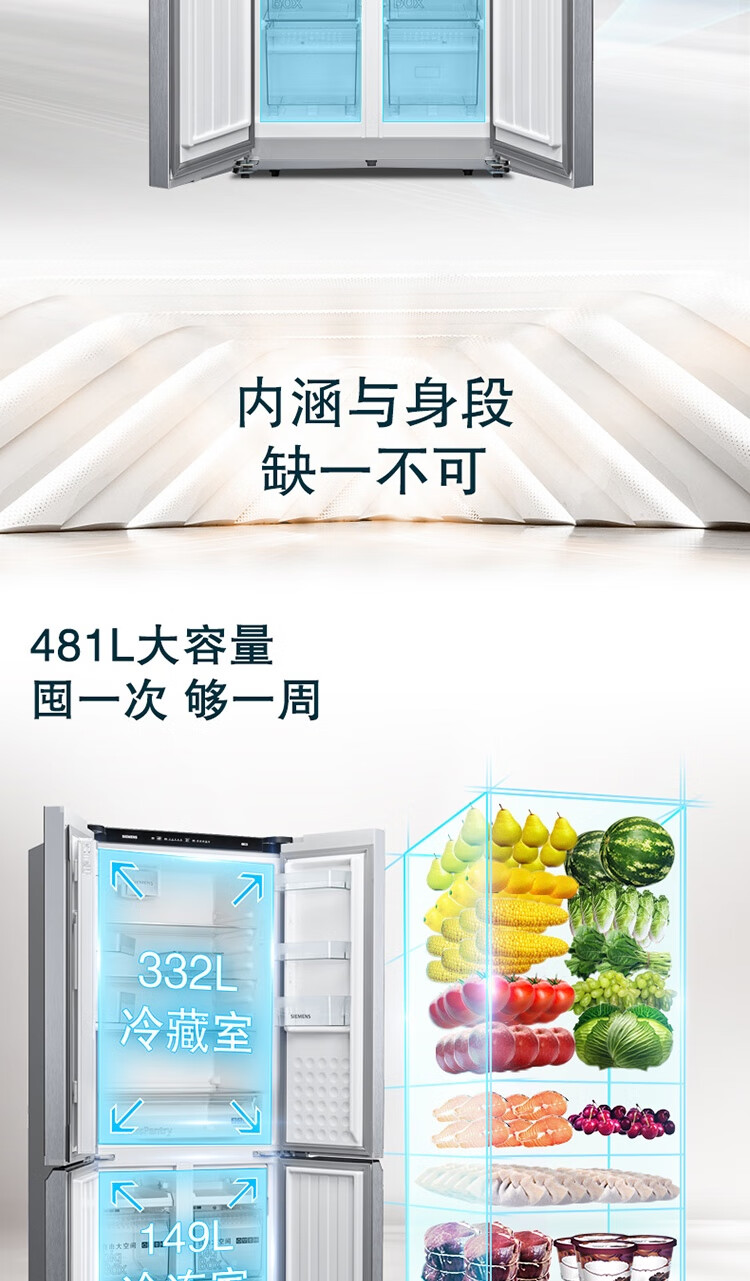 西门子(SIEMENS)481升十字对开门四开门冰箱 家用大容量 混冷无霜 玻璃面板 (晨雾灰) KM49ES43TI